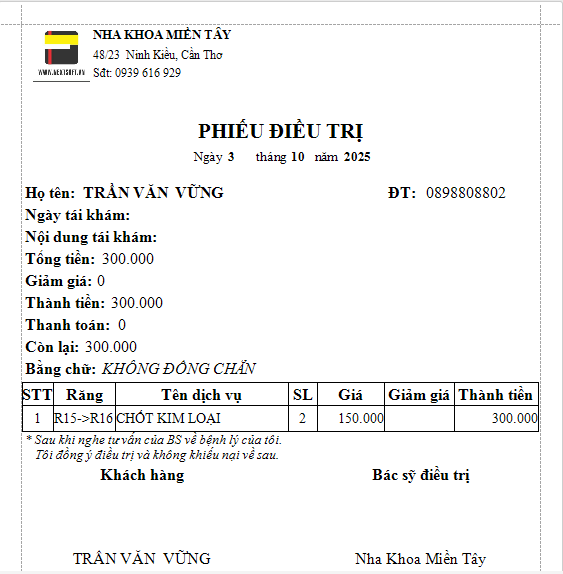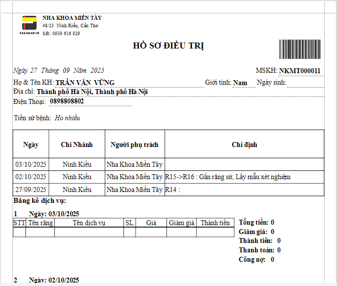 Phiếu in hồ sơ điều trị